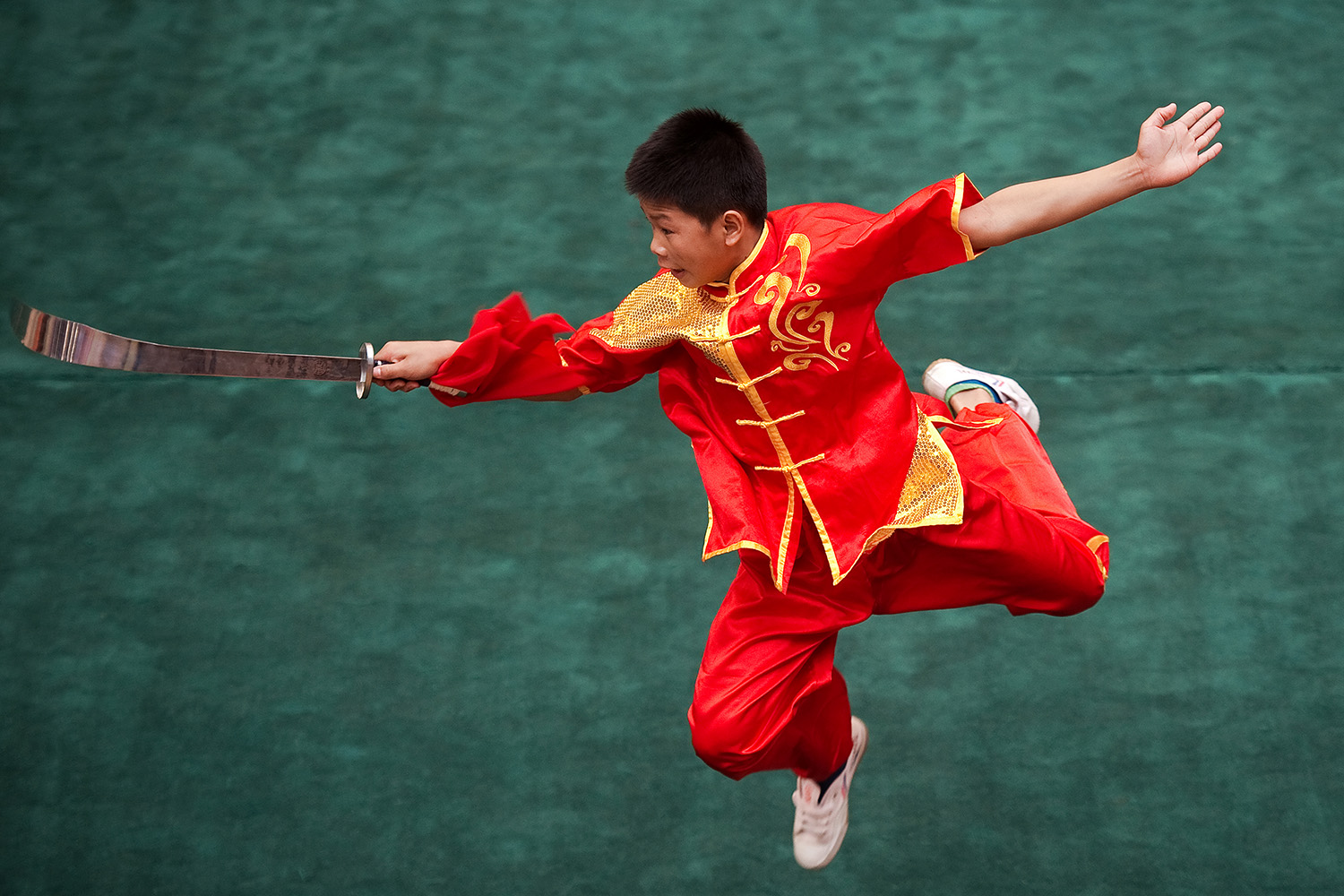 In the non-contact performance version of wushu, competitors are judged on technique and style as they execute a series of movements - either barehanded, or with short or long weapons.