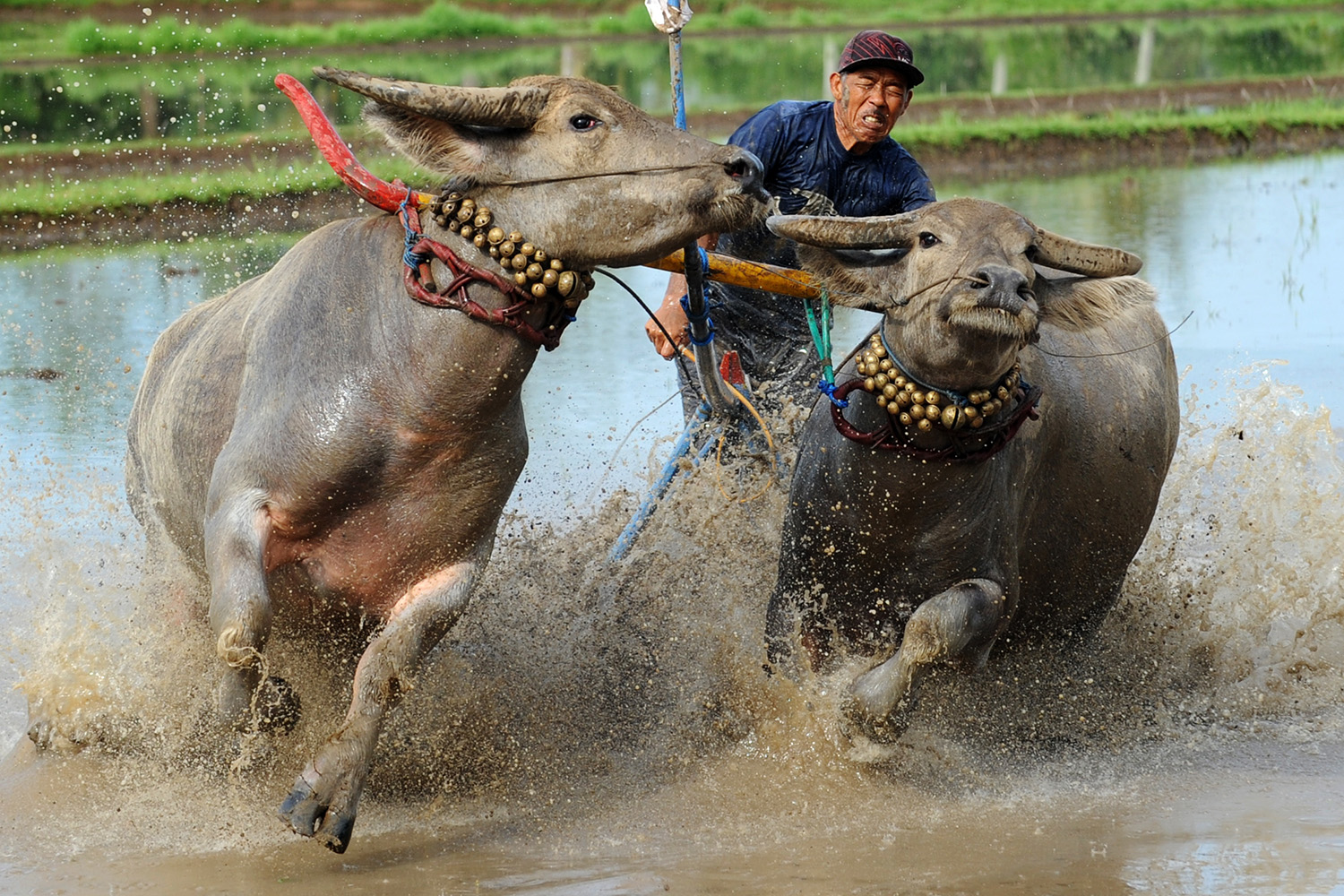 Races are a colourful spectacle with participants standing on speeding carts with flags fluttering from the top, as two buffaloes pull each of the rudimentary vehicles.