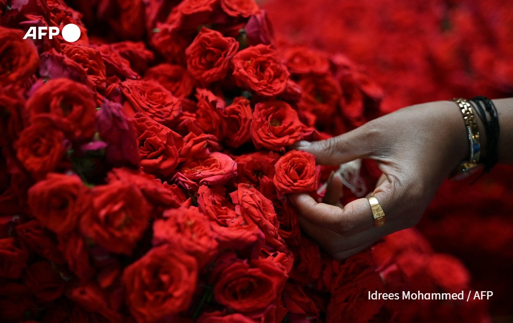 A flower vendor arranges roses for sale on the eve of Valentine’s Day at KR Market in Bengaluru, India on February 13, 2024.