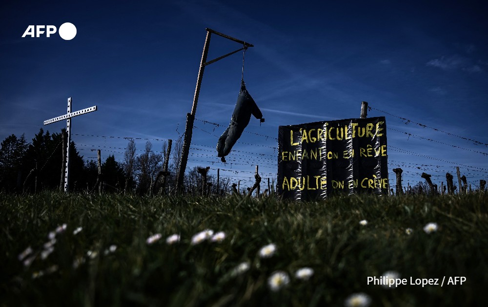 This photograph, taken on February 14, 2024, shows a stuffed farmer’s working coverall (C) and a sign in French that reads 'Agriculture: as a child, you dream; as an adult, you die.' It is displayed near a cross in a vineyard in Calignac, 22 km east of Agen, southwestern France, to raise awareness of excessive financial charges and environmental protection rules, as well as insufficient prices for French farmers' production.