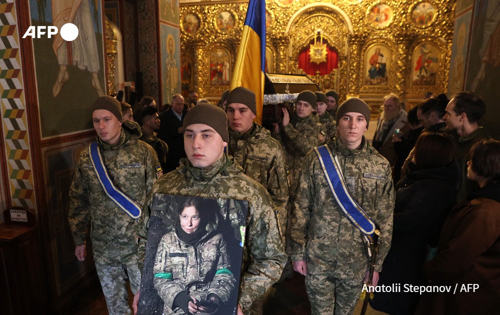 Ukrainian servicemen carry the portrait and coffin of German national Diana Wagner, a volunteer of the Carpathian Sich Battalion, during her funeral service in St. Michael's Cathedral in Kyiv, on February 14, 2024. Diana Wagner was a combat medic who died in eastern Ukraine amid the Russian invasion.