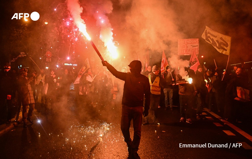 Demonstrators hold flares during a procession against a pension reform in Paris, on January 26, 2023. France's government on January 23, 2023, moved forward with a fiercely contested pensions reform plan that would raise the retirement age to 64, saying balancing the system's books must be top priority.