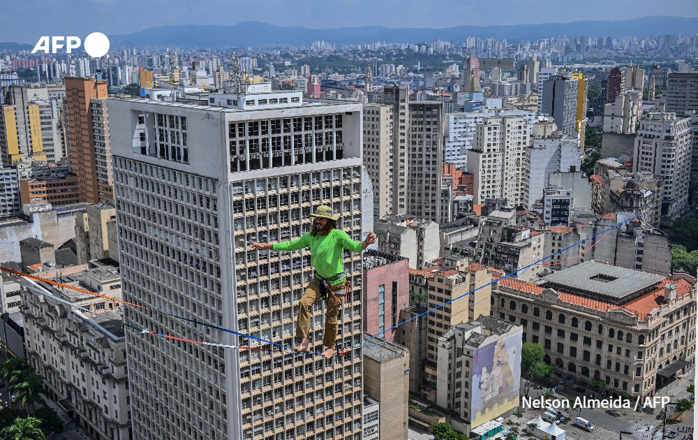 Brazilian highliner Rafael Bridi performs on a slackline 114 meters high and 510 meters long, crossing the entire Vale do Anhangabau, as part of the 469th anniversary of the city of Sao Paulo, Brazil on January 25, 2023. Bridi broke his own urban distance record for the Americas, according to the International Slackline Association.