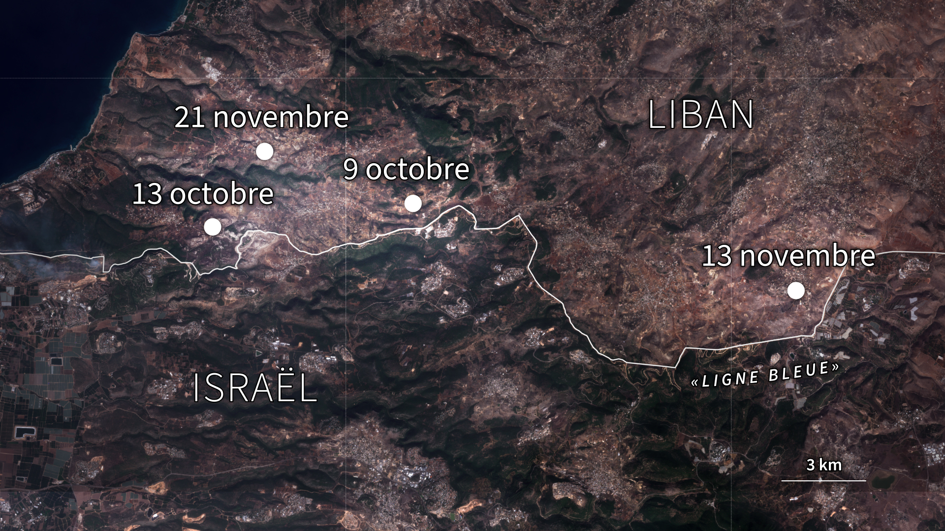 D’autre part, des images satellitaires du matin même et du lendemain récupérées par l’AFP montrent la présence de véhicules militaires de dimension similaire à celle des Merkava sur le site présumé de départ des tirs, tout près de Jordeikh. S’il n’a pas été possible d’identifier précisément quel tank a tiré le 13 octobre, leur géolocalisation concorde avec la trajectoire qu’aurait suivie l’obus de char qui a frappé les journalistes, comme le montre une reconstitution d’Airwars.