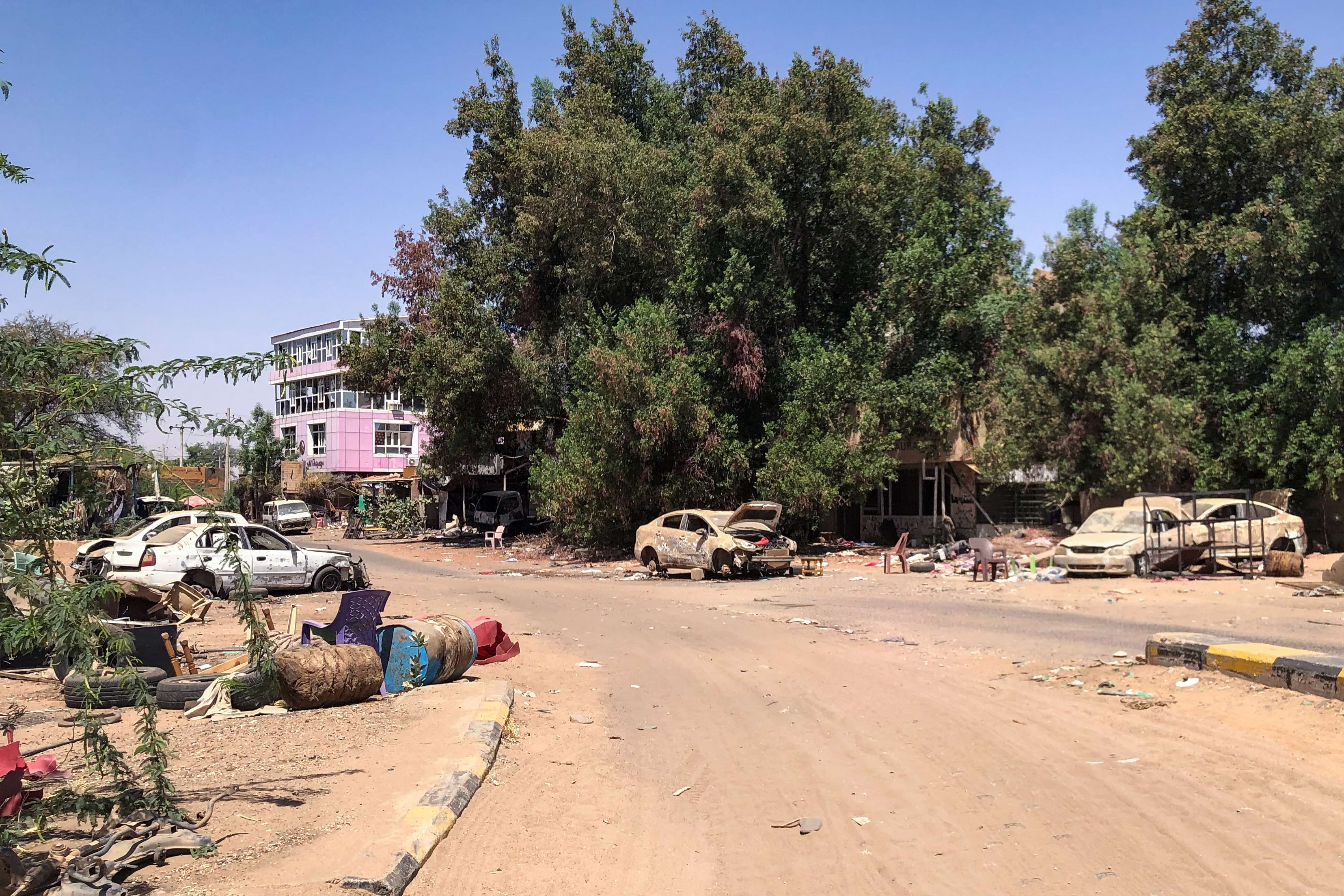 Des voitures endommagées gisent dans une rue déserte de l'île de Tuti au Soudan, presque désertée après deux ans de guerre entre l'armée soudanaise et les forces paramilitaires de soutien rapide (RSF), le 19 avril 2025. © AFP
