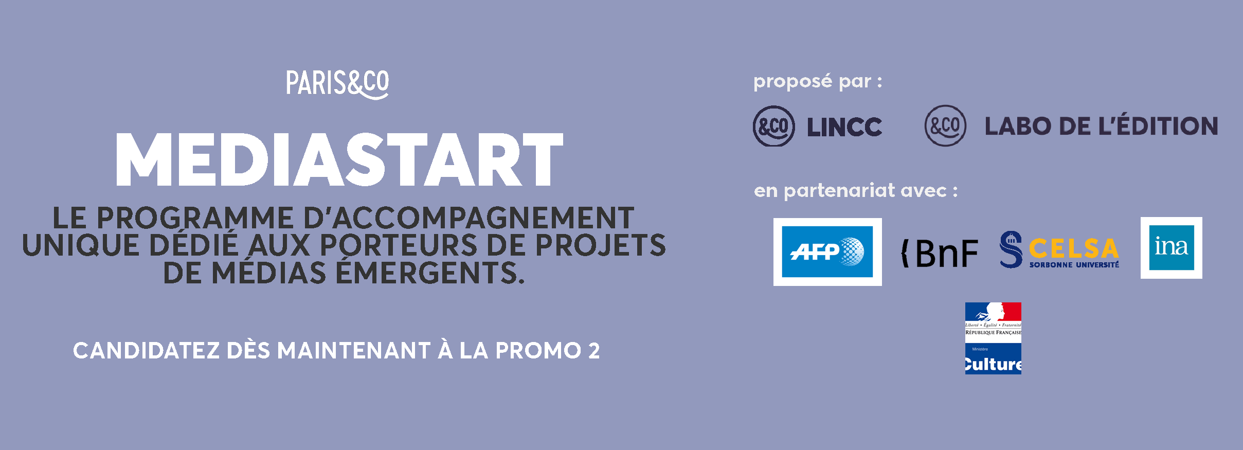 Paris&Co, l’Agence France-Presse, la Bibliothèque nationale de France, le CELSA et l’Institut national de l’audiovisuel lancent un nouvel appel à candidatures pour recruter la seconde promotion de MEDIASTART, le programme d’incubation destiné aux projets innovants de médias émergents, soutenu par le ministère de la Culture dans le cadre du fonds de soutien à l’émergence et à l’innovation dans la presse.