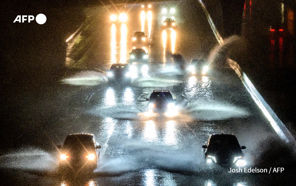 Drivers barrel into standing water on Interstate 101 in San Francisco, California on January 4, 2023. A bomb cyclone smashed into California on January 4, 2023, bringing powerful winds and torrential rain that was expected to cause flooding in areas already saturated by consecutive storms.