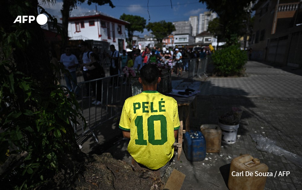 A man wears a jersey of Brazilian football legend Pele as people queue to get in the Urbano Caldeira stadium, also known as Vila Belmiro, where a wake in his honour is being held, in Santos, Sao Paulo State, Brazil, on January 2, 2023. Brazilians bid a final farewell this week to football giant Pele, starting Monday with a 24-hour public wake at the stadium of his long-time team, Santos.